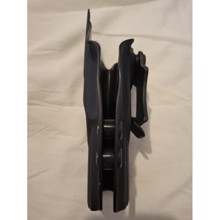 Dieses robuste Kydex-Holster für Rechtshänder bietet diskreten, sicheren Tragekomfort dank Gürtel-Clip. Die beidseitige Formgebung sorgt für perfekte Passung, während Retention und Neigungswinkel individuell einstellbar sind. Ideal für verdecktes Tragen – Zuverlässigkeit und präzise Handwerkskunst in einem.