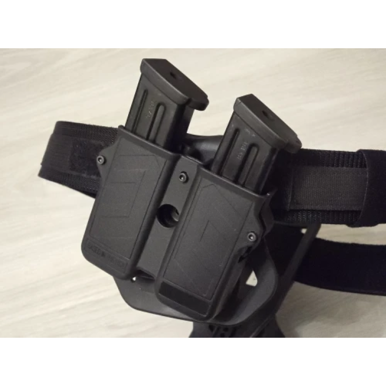 Rüste deine Ausrüstung mit dieser universellen Doppel-Magazintasche aus robustem Polymer auf. Für 9 mm bis .45 Kaliber Magazine geeignet, bietet sie 360° Einstellbarkeit für optimalen Zugriff. Das Paddle-System sorgt für festen Sitz am Gürtel oder an der Hose, während die verstellbaren Schrauben ein sicheres Halten der Magazine garantieren. Ideal für Training, Einsatz und Wettkampf.